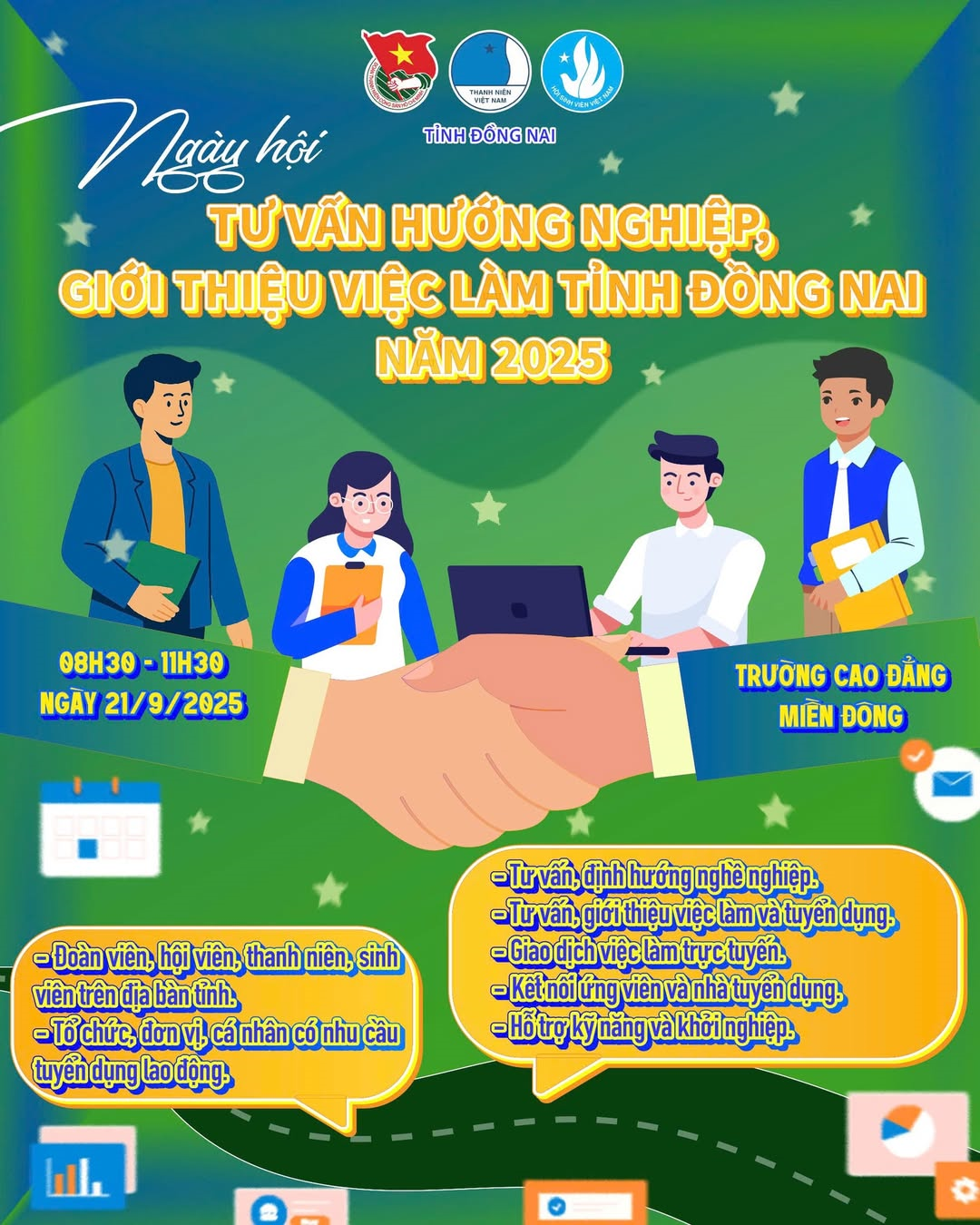 Ngày hội Việc làm tỉnh Đồng Nai năm 2025 được Trung tâm Dịch vụ việc làm tỉnh Đồng Nai tổ chức tại Trường cao đẳng Miền Đông (phường Bình Phước) vào...